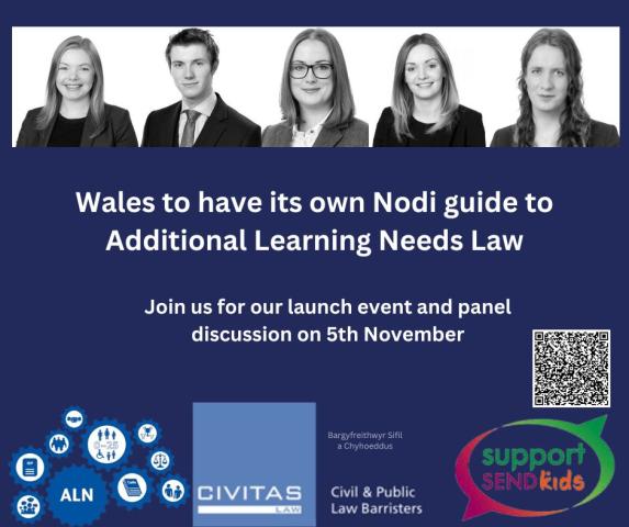 The Education Team at Civitas are thrilled to announce the upcoming publication of the first comprehensive guide to Additional Learning Needs law in Wales. This essential resource is written in conjunction David Wolfe KC (Matrix), Leon Glenister (Landmark) and Support Send Kids. It offers essential guidance on the new ALN framework, following in the footsteps of the renowned Noddy Guide, which has been a vital tool for practitioners for over 20 years.